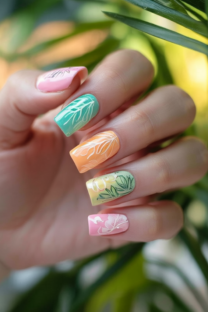 Dreaming of a tropical escape? This leafy design over pastel bases like coral, mint, and yellow feels like the jungle met gel polish. With a bold square nail base, this look balances earthy prints with trendy colors 2025. Ideal for any summer occasion, it checks the box for ideas 2025 square and is a top pick for those craving both freshness and a touch of botanical elegance.