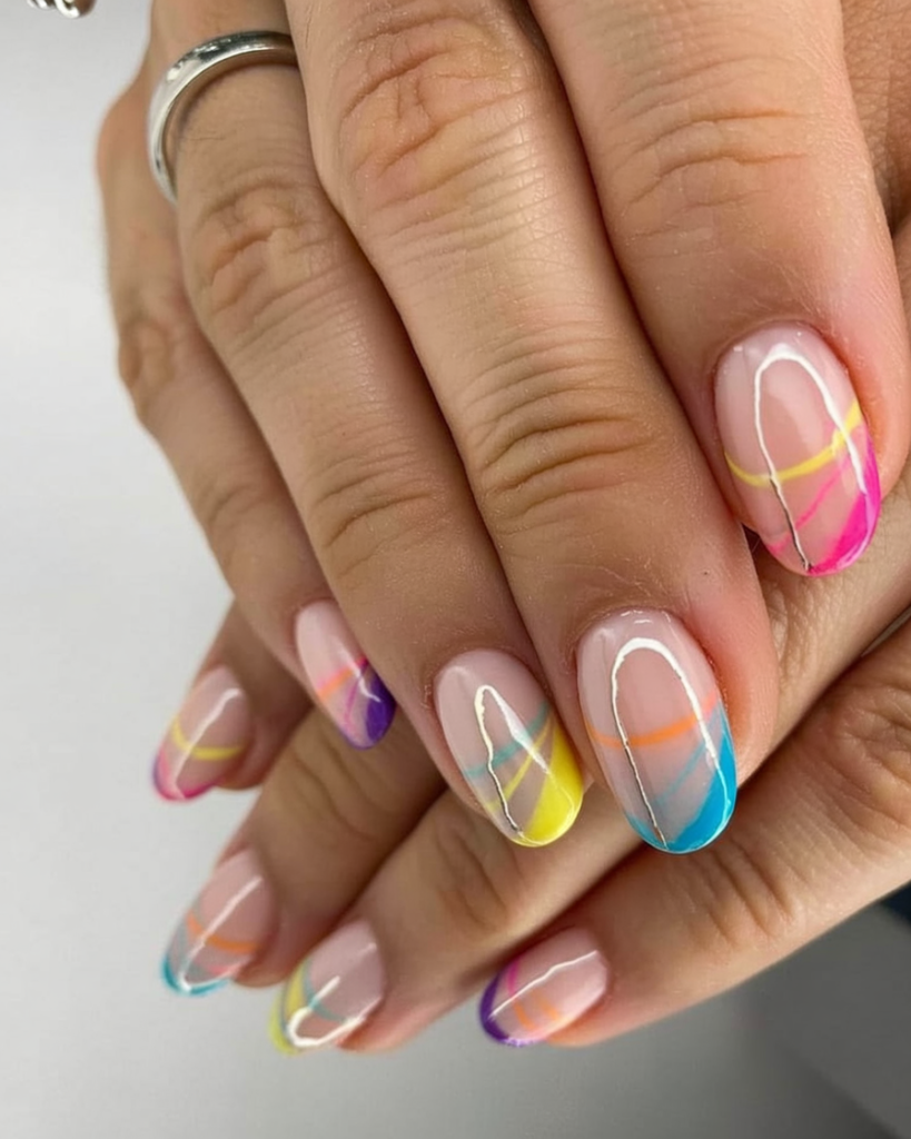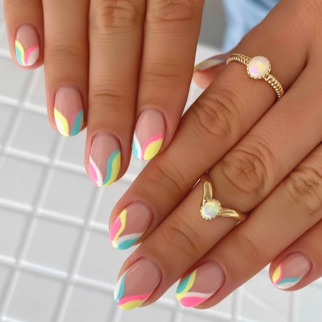 Here’s a nod to the Y2K aesthetic but polished for 2025. Swirling pinks, aquas, and yellows dance over a neutral nail bed, creating a design that’s bold but still minimalist. The soft oval nail shape makes this wearable and flattering for all finger types. Whether you’re dressing up for a birthday or brunch, this falls under ideas simple that stand out.