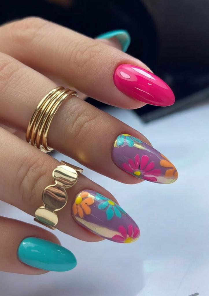 Bright turquoise and electric pink alternate with vintage-inspired flower prints on lilac backgrounds. This almond design is all about expressive colors 2025 and fun throwback vibes. Ideal for retro-themed parties or any fashion-forward occasion, this style turns heads and belongs firmly in the Designs 2025 hall of fame.