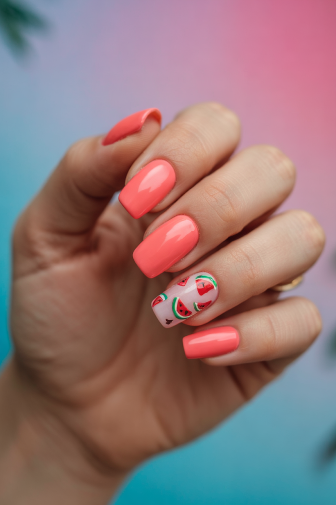 Juicy and refreshing, this short square manicure screams summer picnic. Coral pinks are paired with a cheeky watermelon print that instantly transports you to poolside fun. Ideal for June beach parties or casual days out, this cheeky design is a playful interpretation of ideas 2025 square and colors 2025 that don’t take themselves too seriously.