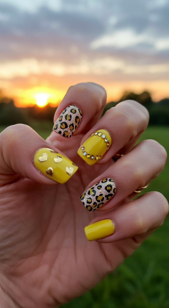 For those ready to roar into summer, this design fuses fierce leopard print with gold hearts and yellow glam. The square shape enhances the edgy aesthetic, perfect for bold personalities. Whether it’s a festival or a night out, this screams Designs 2025 with wild energy and glamour.