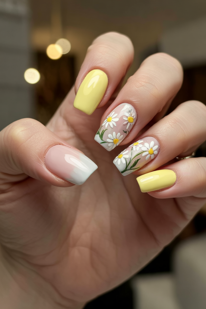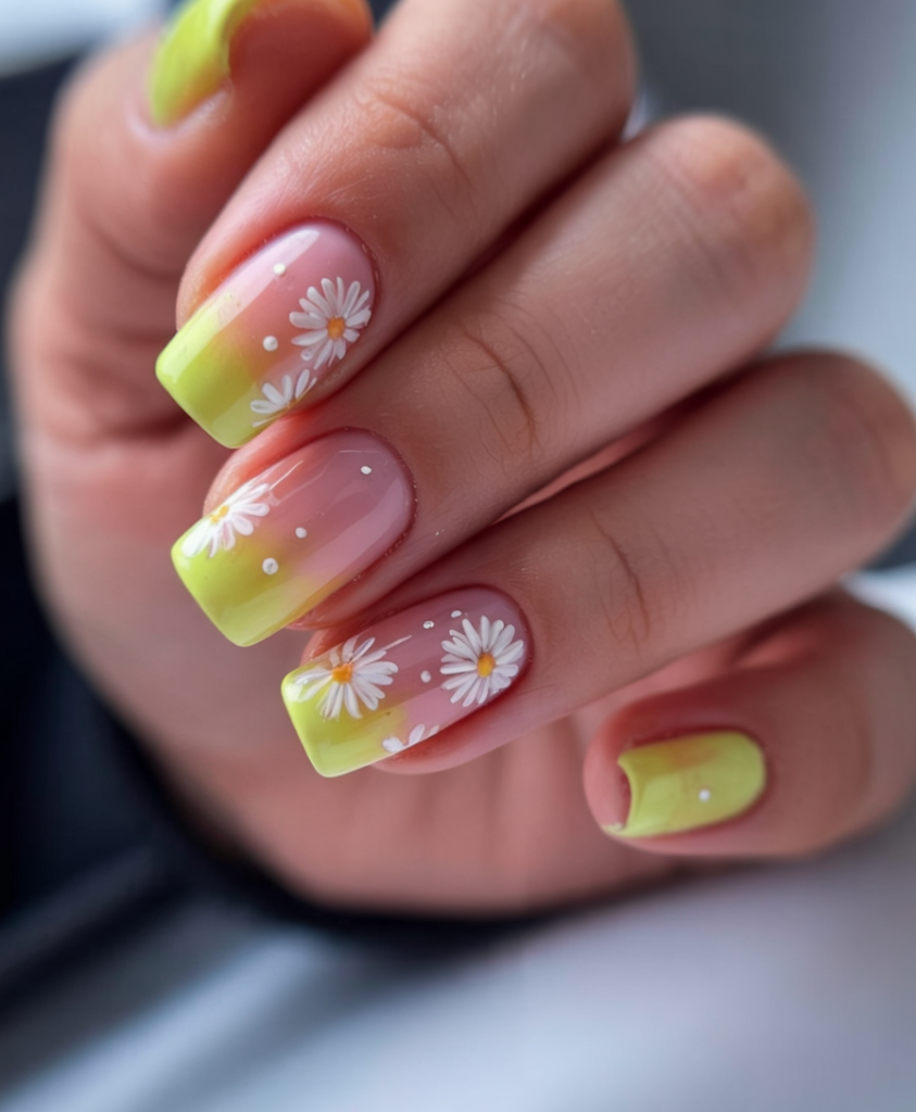 Think countryside charm meets city chic. Daisies bloom across a clean background of white ombré and lemon yellow in this adorable square look. It brings together delicate art with bold seasonal colors 2025, great for bridesmaids, brides, or anyone craving floral freshness.