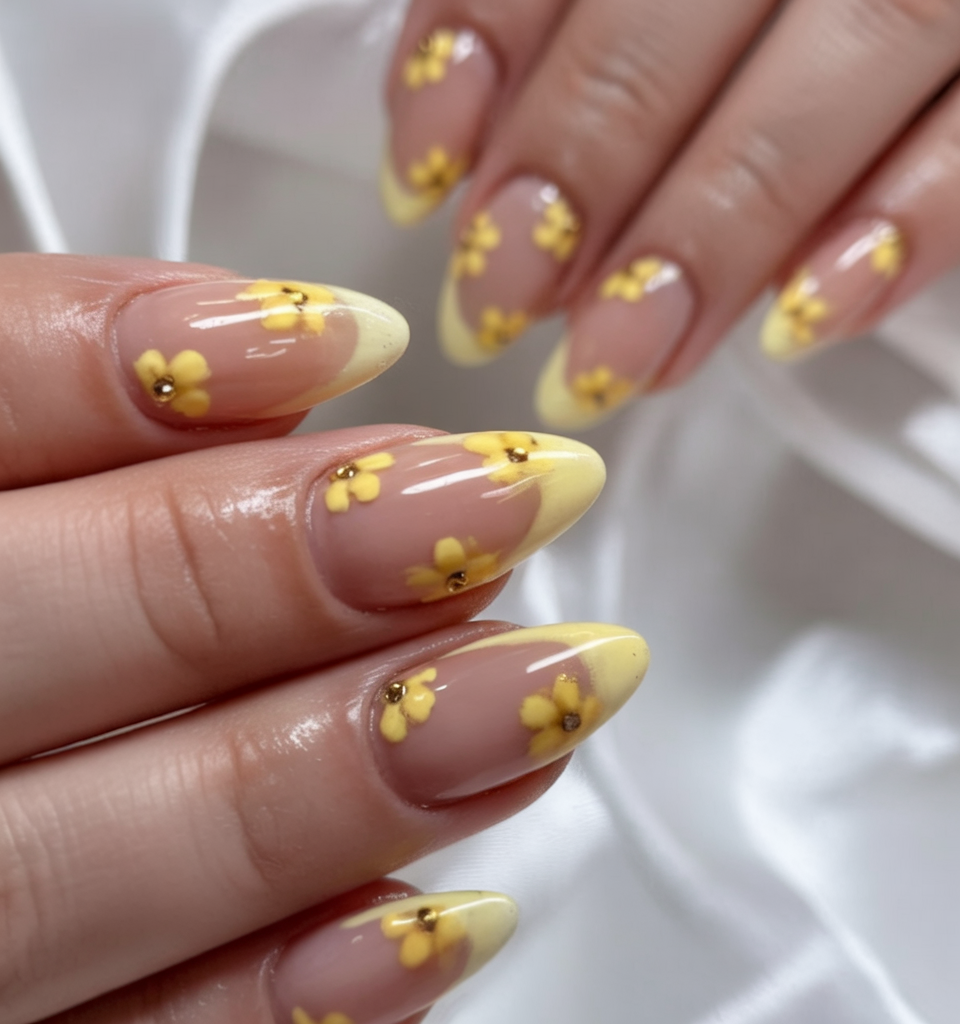 Delicate yellow floral accents rest on sheer nude bases, with some nails featuring buttery french tips that gracefully taper. Each tiny bloom is centered with a golden stud, creating a subtle sparkle that catches the light. This design blends colors 2025 like pastel yellow with a nail shape that elongates the fingers. Ideal for June birthday celebrations or casual sunny days, this falls under timeless ideas 2025 almond with just enough flair to feel fresh.