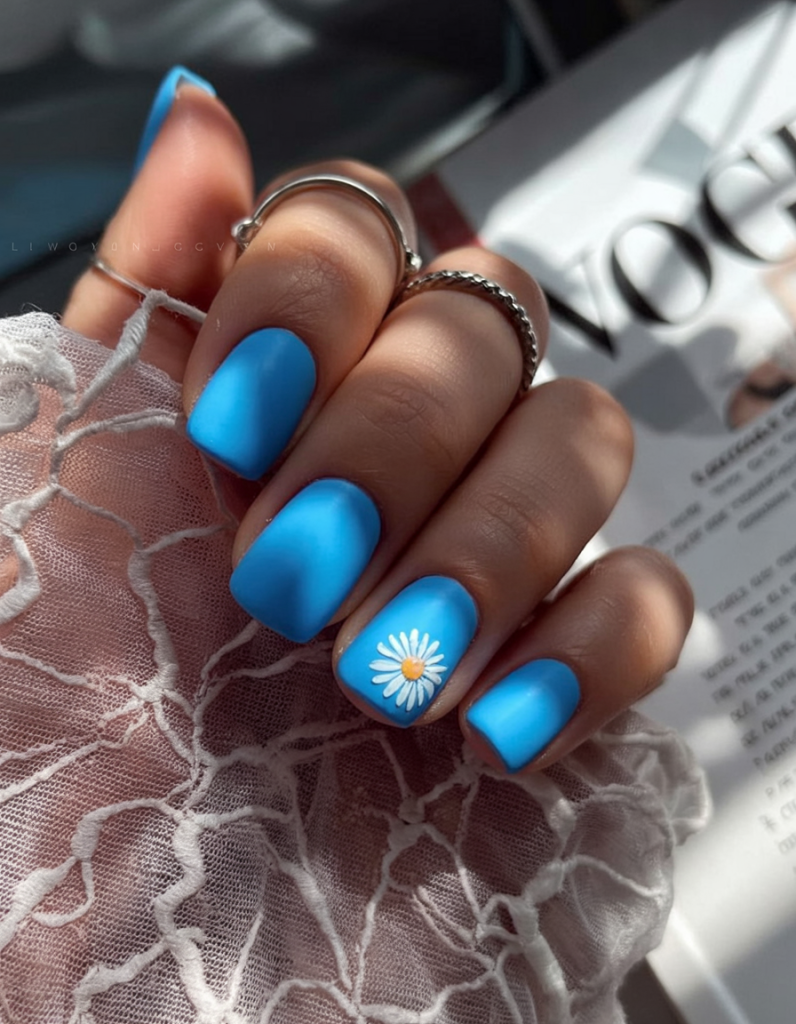 Sometimes simplicity steals the show. This solid matte sky blue set is accented with a single daisy on the ring finger, making it ideal for fans of ideas simple with charm. Perfect for short nails and lovers of minimal, this design checks all the boxes for clean Inspo 2025 with a floral twist.