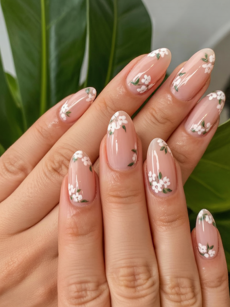 Floral but not overdone, this design speaks to lovers of ideas simple and refined. Tiny white flowers with dainty green leaves wrap gently along the edges of a glossy oval nail. The neutral base lets the minimalist blossoms breathe, making this style perfect for anyone craving wedding-ready nails or feminine everyday elegance. This look fits seamlessly into ideas 2025 almond and oval categories.
