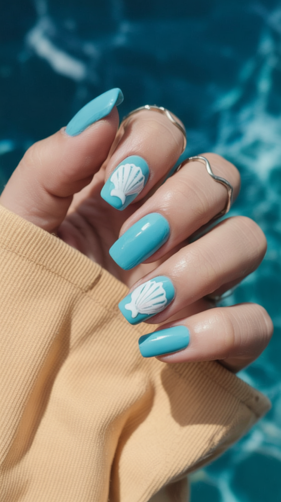 Hello, beach inspo! This vibrant turquoise manicure features detailed white seashells over a smooth, high-gloss finish. It’s a perfect tribute to tropical waters and sun-soaked holidays. The square nail shape gives off a youthful, playful vibe. These nails scream vacation, making them perfect for any getaway or pool party. Definitely a contender for ideas 2025 square, especially for summer-loving fashionistas.