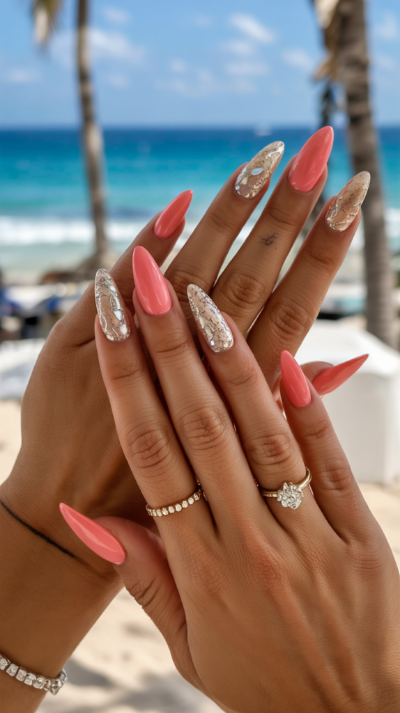 These nails are made for spotlight moments. A bold coral hue covers half the nails while the rest shimmer in metallic glitter with reflective textures. The almond shape adds a red-carpet-ready silhouette. This combo works well for a glam birthday, beach party, or even as a bold bride statement. Sparkle meets sophistication in this top-tier ideas 2025 almond entry.
