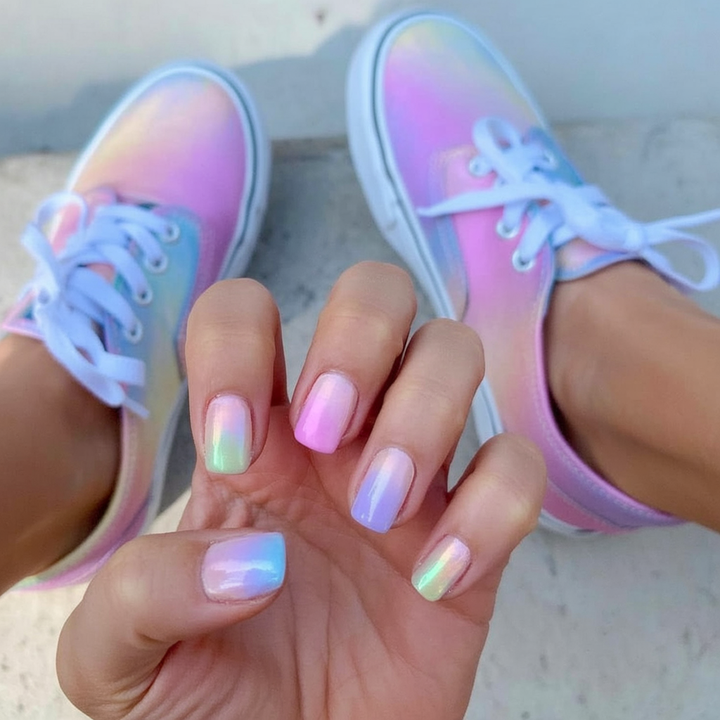 Pastel gradients bring a whimsical, dreamy vibe to this manicure. With hues transitioning from mint to pink, lilac, and blue, this is cute overload in the best way possible. Paired with coordinating sneakers, this look is perfect for the ultimate Inspo 2025 post. Short and square, these are top-tier ideas 2025 short and square picks for those wanting color variety without overwhelming detail.