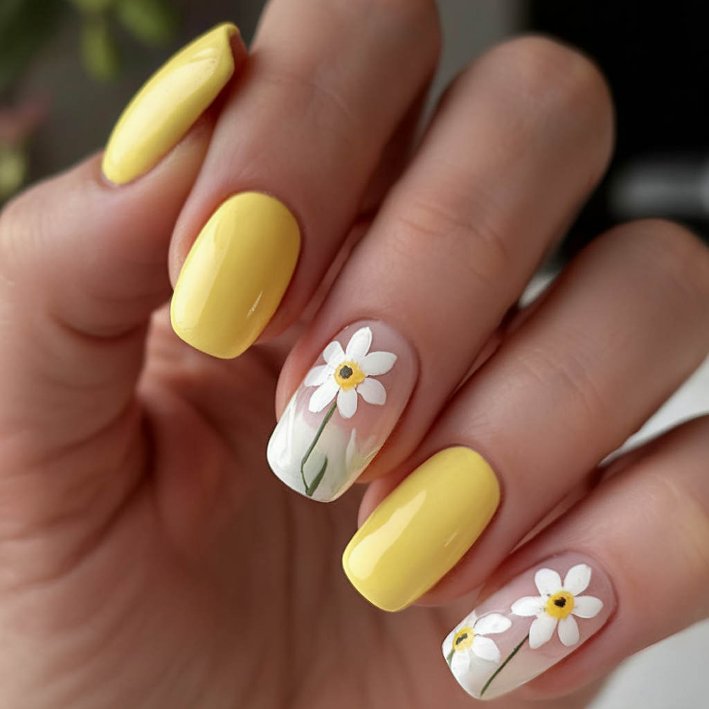 Yellow nails always scream summer, and when paired with cheerful daisy designs, you’ve got yourself a seasonal classic. These nails balance solid color with floral art beautifully. The square shape offers durability and style, ideal for short nail lovers. This look is sunshine on your fingertips — perfect for birthday, bride, or simply radiating joy.