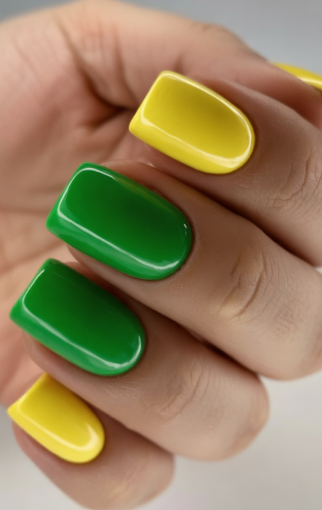 Bold, glossy green and yellow alternate in this powerful color-block design. It’s simple but commanding. The square nails here play into the rising 2025 trends of vibrant contrasts and straightforward polish. This one is for confident minimalists or those repping flag colors for a beach day or summer event. A must-mention in the ideas 2025 short playbook.