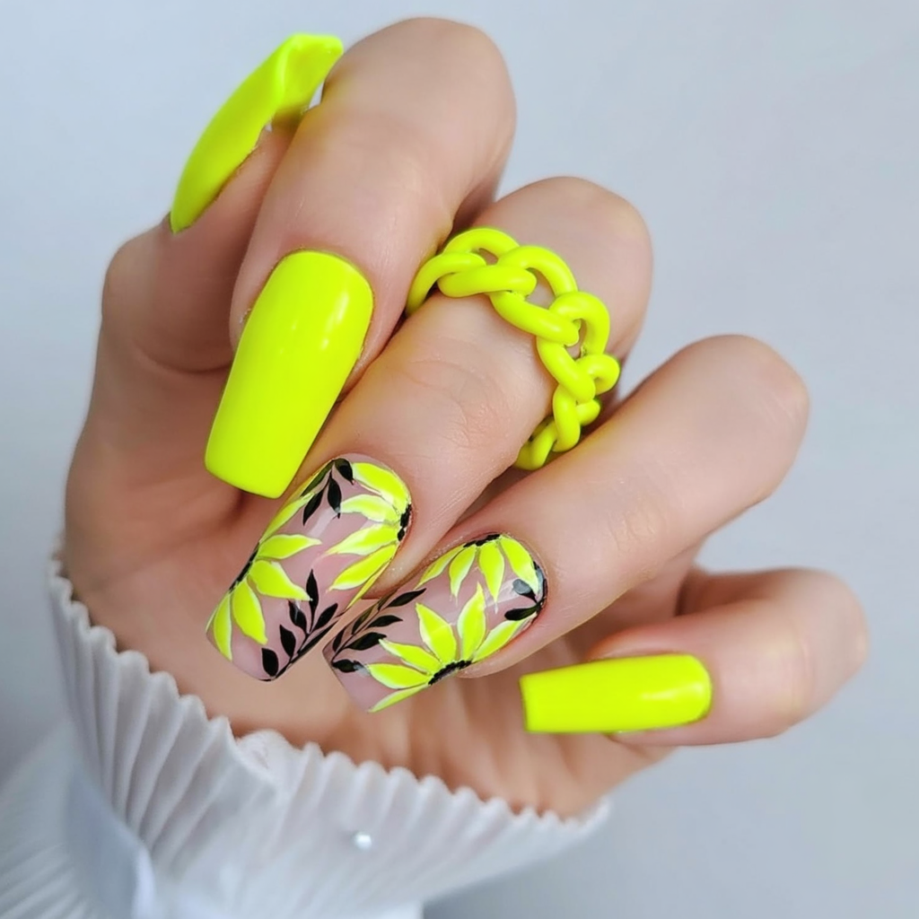 Get loud with this electric neon yellow design featuring bold black-and-yellow leaf art. Perfect for long, square nails, this look is unapologetically summery. A hot pick for birthday parties, festivals, or to stand out at any beach outing. This electrifying entry easily checks the box for standout Designs 2025.