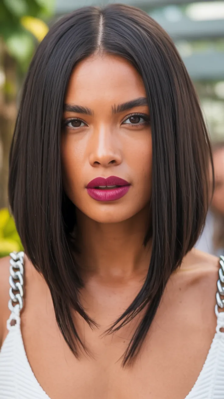This long bob is sleek in a way that feels instantly dressed up. The smooth center part, the glossy finish, and the strong line through the ends create that polished evening look without making the hair feel too formal. It has that clean, refined quality that works beautifully with bold lipstick, sculpted brows, and simple clothes that let the haircut shine. There’s a subtle power in a style like this. It doesn’t need volume or heavy Layers to stand out because the precision is the beauty. It’s timeless, chic, and exactly the sort of look that makes you feel put together the minute you walk out the door.