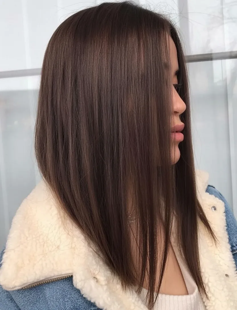 This style feels soft in the prettiest possible way. The gentle shape, the rich Brown tone, and the quiet little bend through the ends make it look romantic without being overly styled. It has that “healthy, glossy, expensive” energy that always lands well, especially when you want a haircut that looks put-together but still relaxed. There’s a softness around the face here that makes the whole look feel approachable and feminine, and it’s exactly the kind of long bob that works whether you’re in jeans and a knit tank or dressed up for dinner. It’s pretty, easy, and just polished enough to make you feel like the best version of yourself.