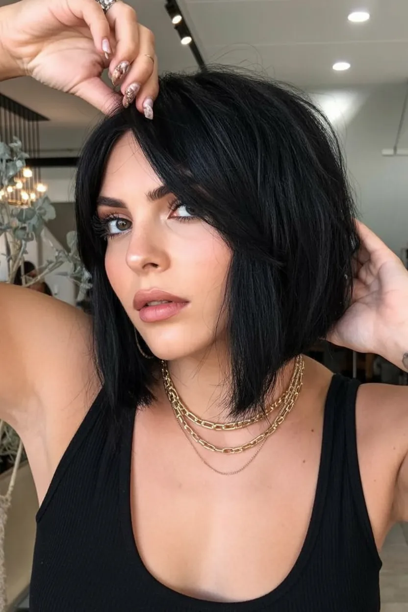 This one is for the woman who wants her hair to have a little attitude. The dark glossy bob already feels sharp and modern, but those softly separated front pieces give it that cool, undone finish that keeps it from feeling too perfect. It’s sultry, confident, and a little bit moody in the best way. There’s something about this shape that reads instantly stylish, like the haircut is doing half the work for your whole beauty look. It feels playful and polished at the same time, which is a tricky balance, but this cut absolutely nails it.