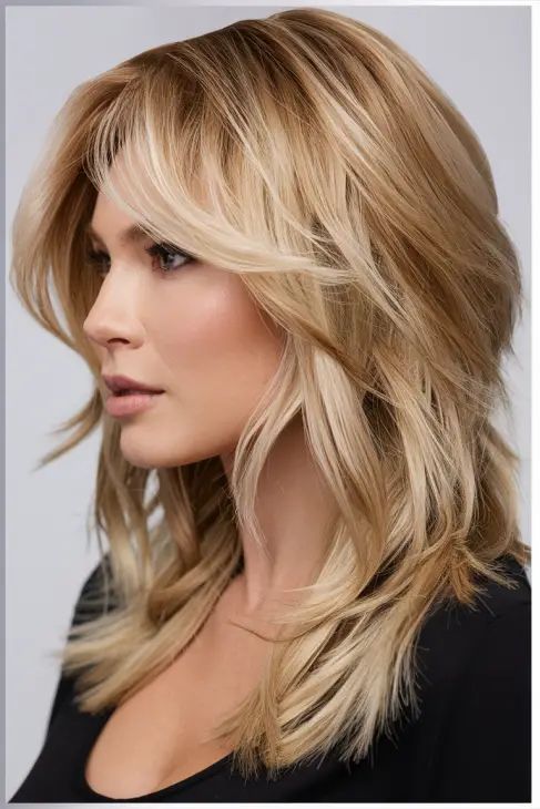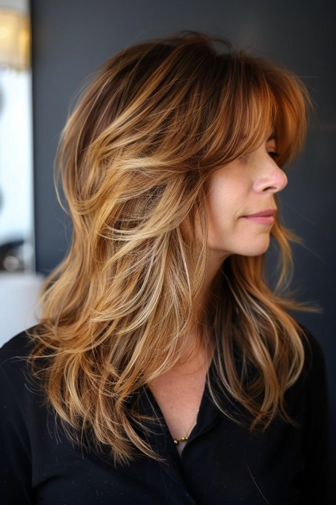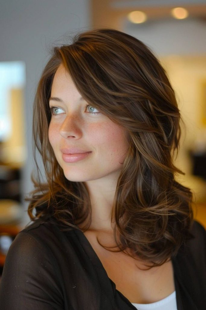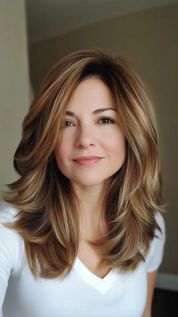 For those seeking a sun-kissed glow, this style combines medium-length layers with balayage highlights. It’s ideal for wavy hair and for women who want a natural, low-maintenance look. The layers add depth and dimension, complementing the light-catching balayage tones.