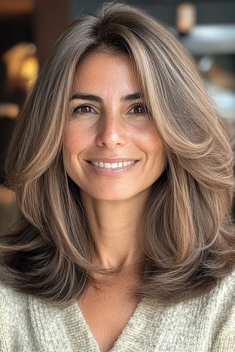 A voluminous blowout elevates this layered look into a statement of sophistication. Ideal for women over 50, the flowing layers frame the face beautifully while creating a youthful, lively appearance. The versatility of this cut makes it a favorite across all hair textures.