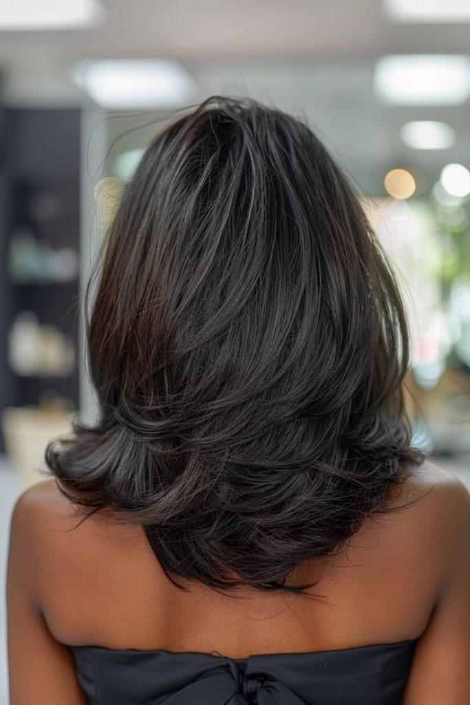 Ideal for thick hair, this layered look showcases bold cuts that bring out the hair’s natural volume and shine. The sleek finish is suitable for both casual brunches and formal evenings. Women with darker tones will find this style strikingly flattering.