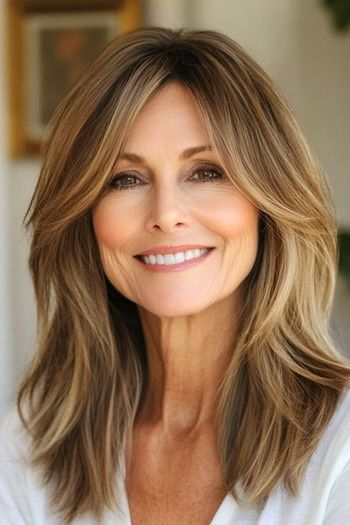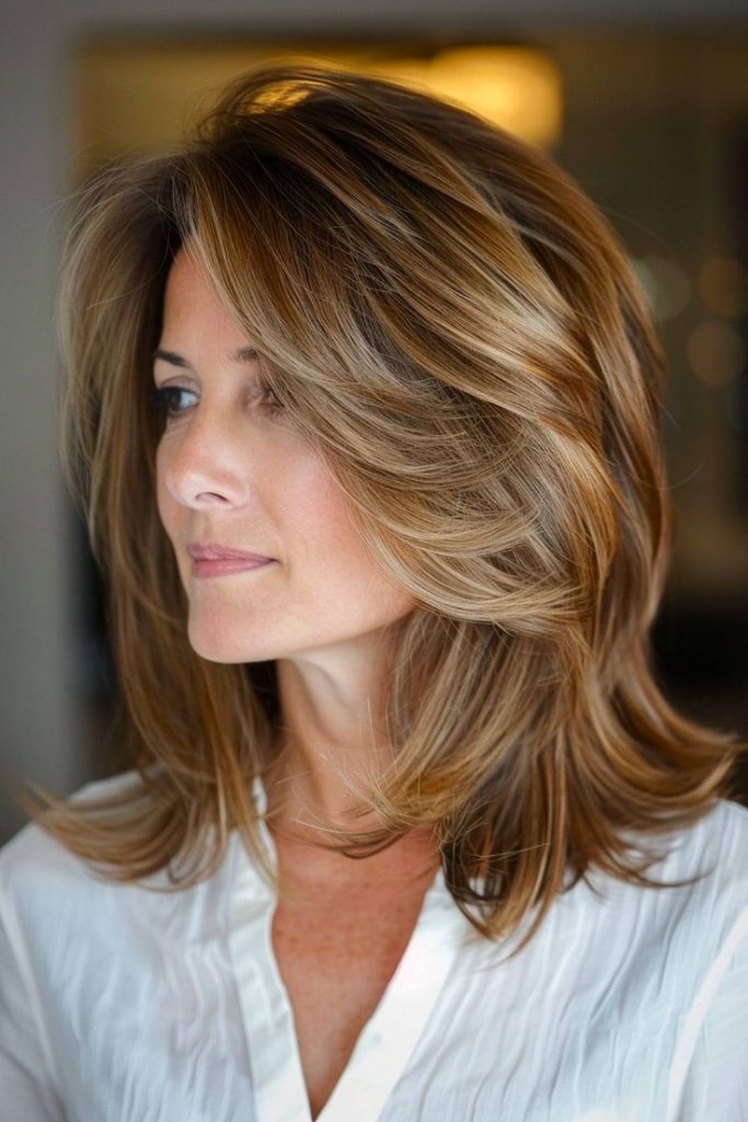 This universally appealing cut offers medium length layers that blend seamlessly into natural waves. Warm highlights enhance the movement of the layers, making it a go-to for women over 50 looking for something contemporary yet low maintenance.