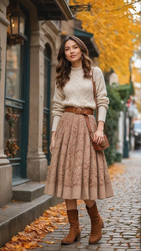This elegant fall look pairs a cable-knit cream sweater with a textured, belted beige midi skirt. Styled with brown ankle boots and a small crossbody bag, it creates a warm, vintage-inspired outfit ideal for an autumn stroll or casual outings.