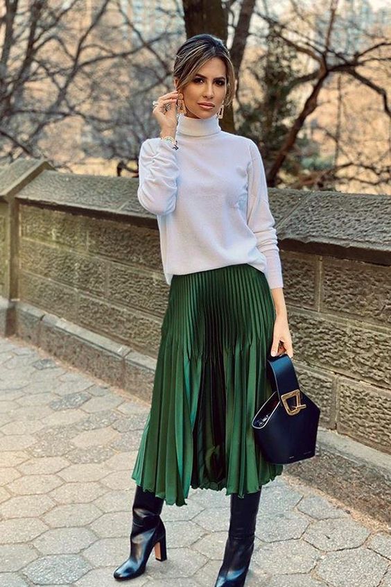 A sophisticated outfit featuring a white turtleneck sweater paired with a deep green pleated midi skirt. Styled with black knee-high boots and a structured black handbag, this look combines elegance with comfort, perfect for both casual and formal settings.