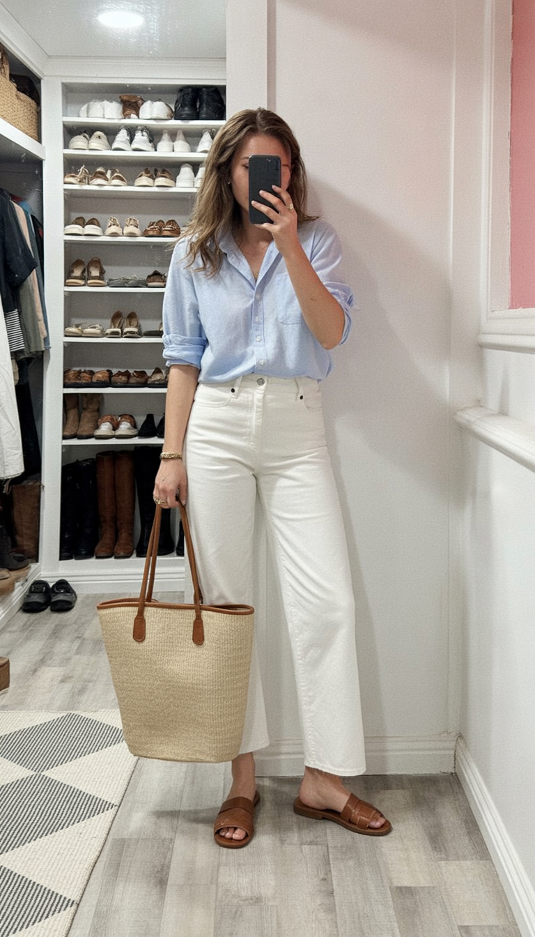 This outfit feels calm, clean, and quietly confident. A light blue shirt paired with white trousers gives that fresh spring energy that always feels right. It’s simple, polished, and deeply wearable.