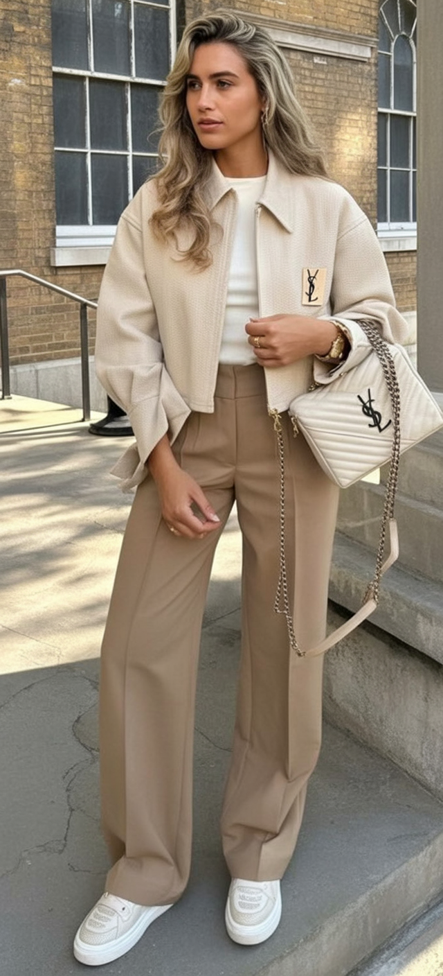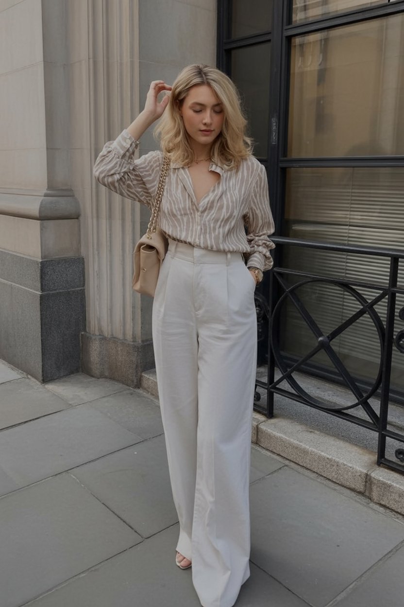 This look has a relaxed sophistication that feels effortless and refined. The soft blouse adds texture and warmth, while the tailored white pants keep the silhouette clean and elegant. It’s understated but full of character.
