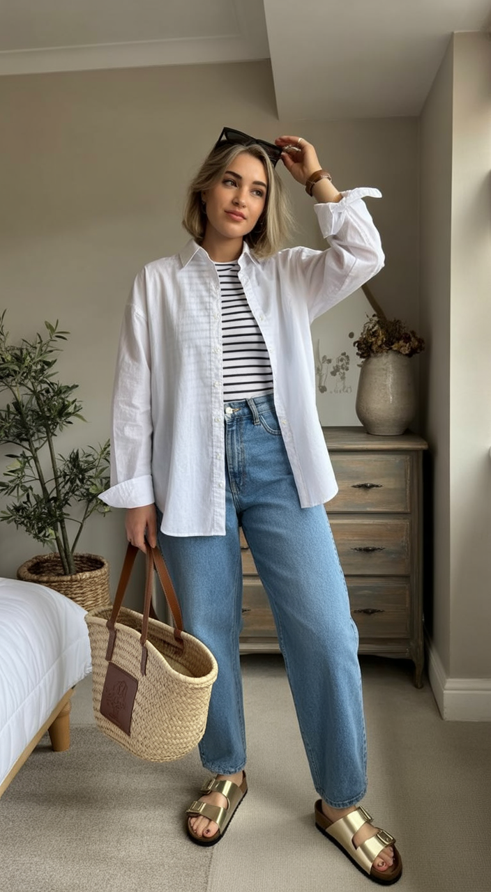 This combination works beautifully for women’s casual wardrobes built around a capsule approach. Straight or relaxed jeans balance the structure of the shirt and flatter many body types, including plus size. Roll the sleeves, add flat sandals, and you’re ready. It’s casual, timeless, and exactly the kind of look women will reach for again and again in 2026.