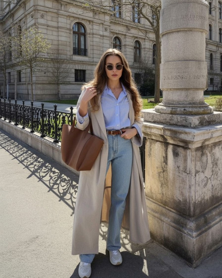 A long neutral jacket instantly elevates even the simplest outfit. Worn over denim, it creates a strong yet relaxed silhouette that feels timeless and thoughtful. This look carries that old money attitude—polished, composed, and quietly confident—perfect for spring walks, city days, or casual meetings.