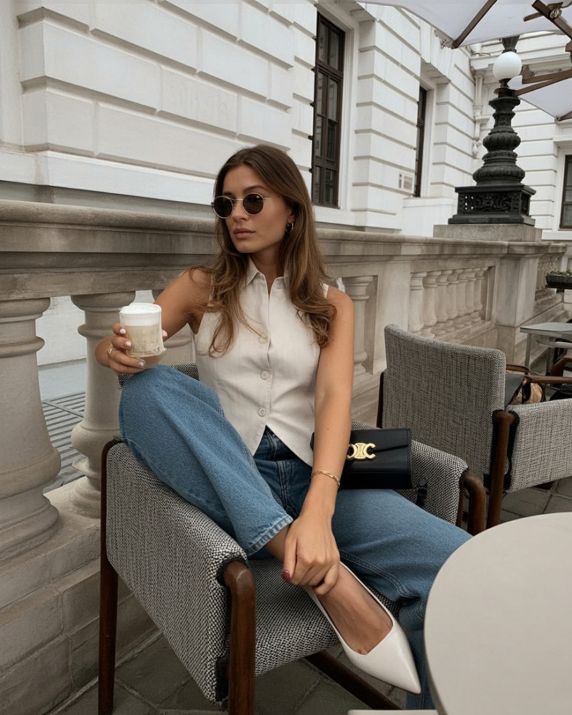 This outfit feels calm, confident, and refreshingly honest. A sleeveless neutral top paired with relaxed jeans gives off that effortless old money mood—nothing overdone, nothing unnecessary. It’s the kind of look that feels natural, as if it came together without a second thought.