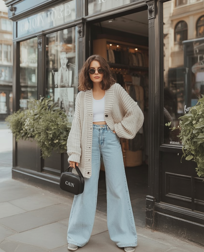 This outfit has a relaxed, confident vibe that feels perfectly balanced. A cozy cardigan paired with wide-leg jeans creates a silhouette that’s comfortable yet stylish. It’s casual, but with intention—exactly what old money style does so well.