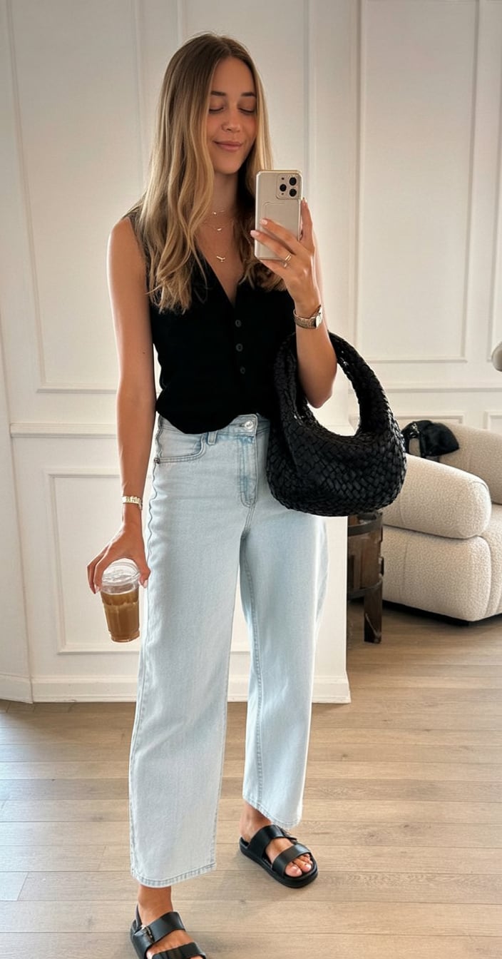This look is all about quiet confidence. A simple black sleeveless top paired with light denim feels clean, modern, and effortlessly chic. There’s no need for extra layers or bold details—the beauty comes from restraint. It’s a look that feels powerful in its simplicity and fits naturally into an old-money-inspired wardrobe.