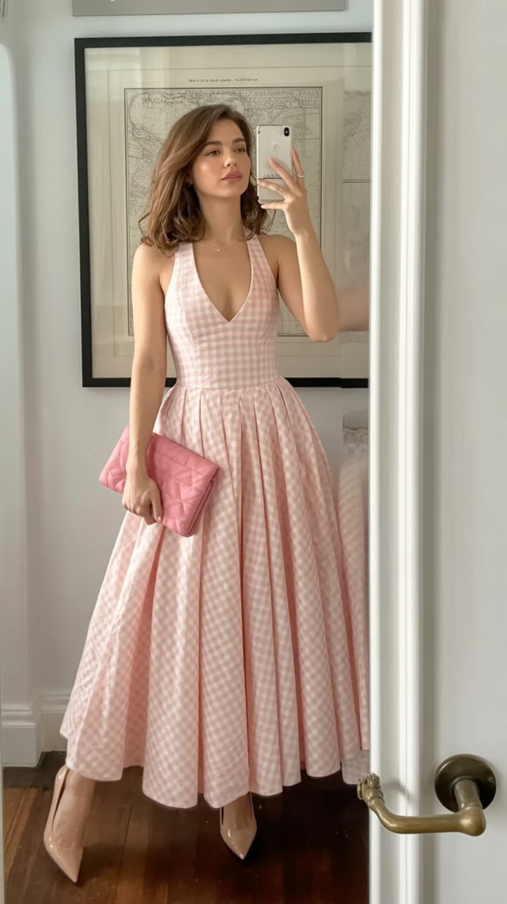Gingham always carries a sense of freshness, especially in spring. This dress feels structured yet soft, blending classic femininity with modern ease. It captures that old money charm—timeless, graceful, and never overly styled.