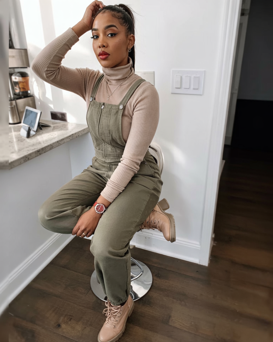 This outfit is all about calm, grounded tones: muted green overalls paired with a ribbed cream turtleneck and matching lace-up boots. The effect is quietly luxe, like loungewear that decided to step up and handle the day. Sitting at the counter with a coffee in hand, the whole look feels practical but still photo-ready, thanks to the sleek ponytail and understated jewelry.