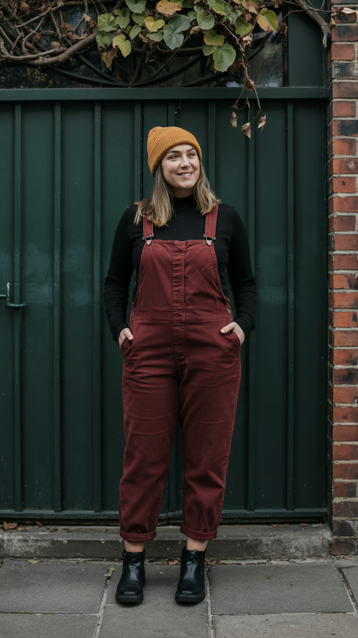 Rich rust corduroy instantly makes these overalls feel like fall leaves and pumpkin lattes in outfit form. The warm brown tone looks gorgeous against the simple black turtleneck and matching boots, and the beanie adds that extra touch of laid-back charm. It’s the kind of outfit you can wear to the farmers’ market, a casual office, or a weekend day trip and feel perfectly dressed for all of it.