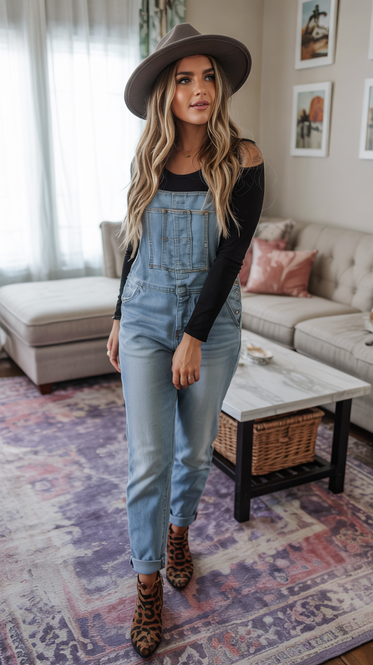 There’s something so nostalgic and fresh about these light Jean overalls paired with a fitted black top and wide-brim hat. The wash feels softly worn-in, like a favorite pair of jeans, while the lean silhouette keeps the look polished enough for brunch or casual Fridays. Leopard booties peeking out at the hem add a little wink of personality so the outfit reads playful instead of plain.