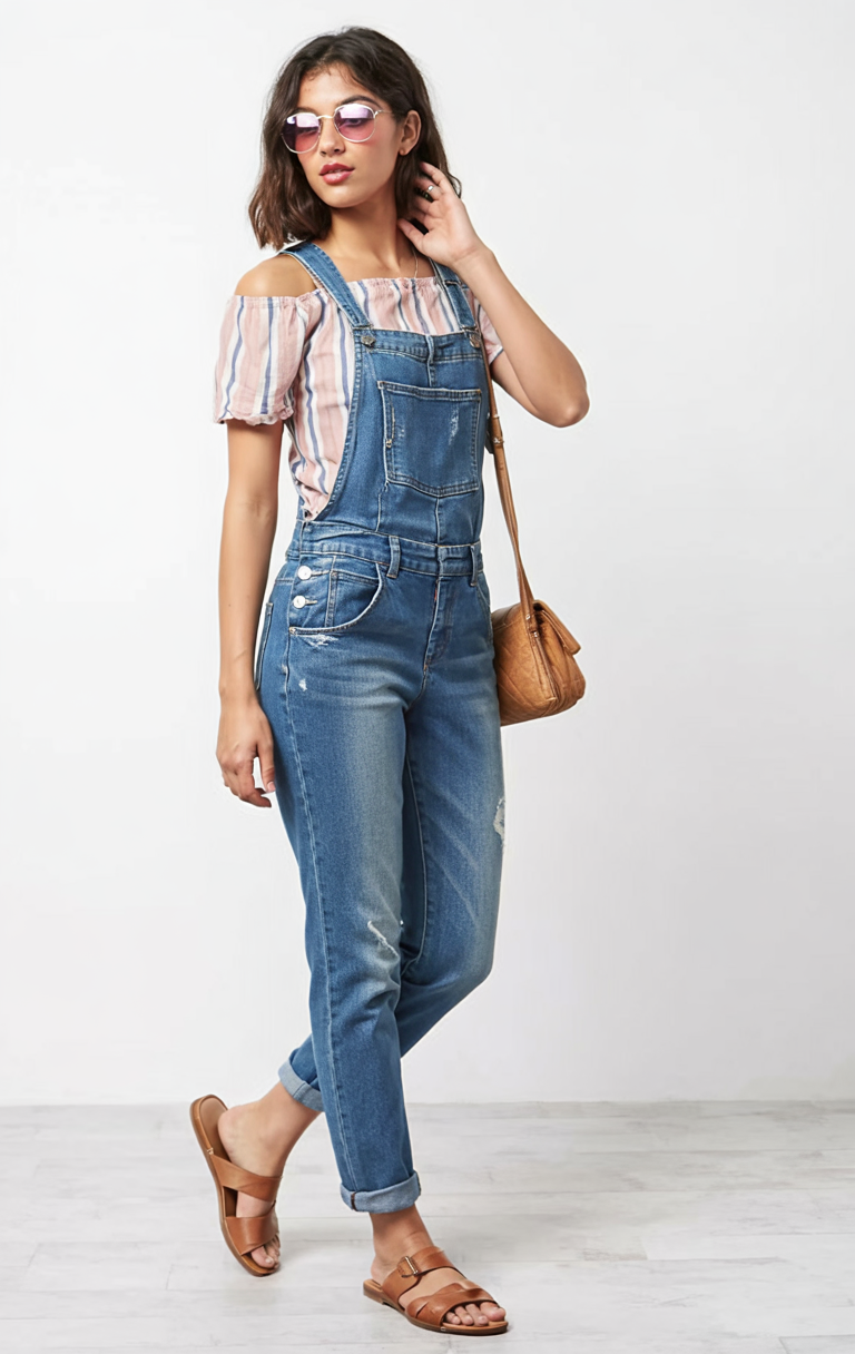 To style something similar, keep your layers light and your accessories simple so the denim remains the star. Choose a fitted or elastic-neck top that won’t bunch under the straps, and roll the cuffs to hit just above the ankle for a flattering line with flat sandals. A neutral bag and minimal jewelry keep the aesthetic clean, while a swipe of rosy lipstick or gloss ties in with the stripes. It’s one of those easy overalls outfit ideas you can repeat all season without getting bored.