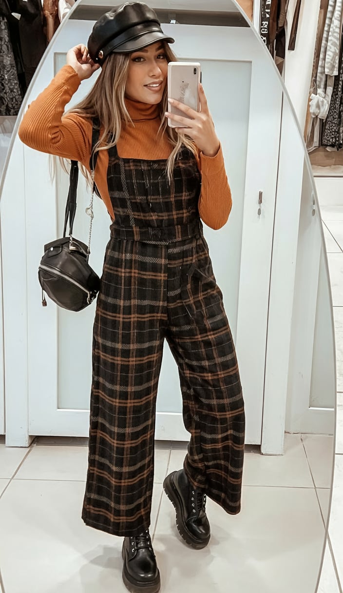 These plaid overalls are pure fall fun—soft brown and black checks, wide leg lines, and a fitted rust turtleneck that feels like pumpkin spice season in outfit form. Chunky boots and a structured cap add a little 90s edge, while the crossbody bag keeps the look functional for real life. It’s the kind of ensemble that makes you want to plan a coffee date or bookstore wander just to show it off.