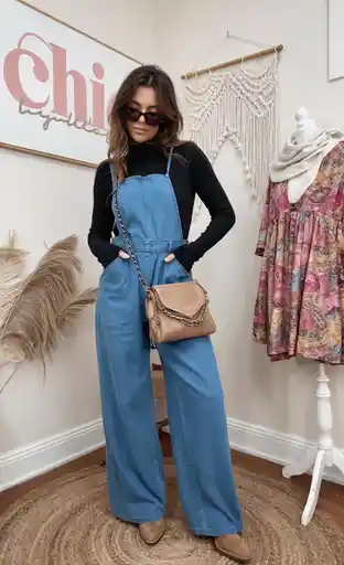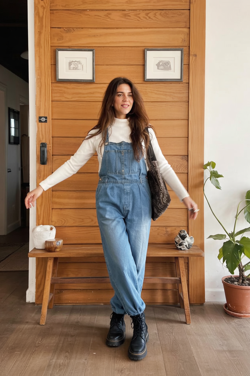 This look feels like a cozy weekend at a cabin: light blue overalls, a simple white turtleneck, and sturdy black boots planted on warm wooden floors. The relaxed, slightly gathered ankle adds a modern twist to the classic Jean shape, while the high bib and straight leg keep things timeless. It’s comfortable, unfussy, and quietly stylish—exactly what you want for slow mornings and long coffee chats.