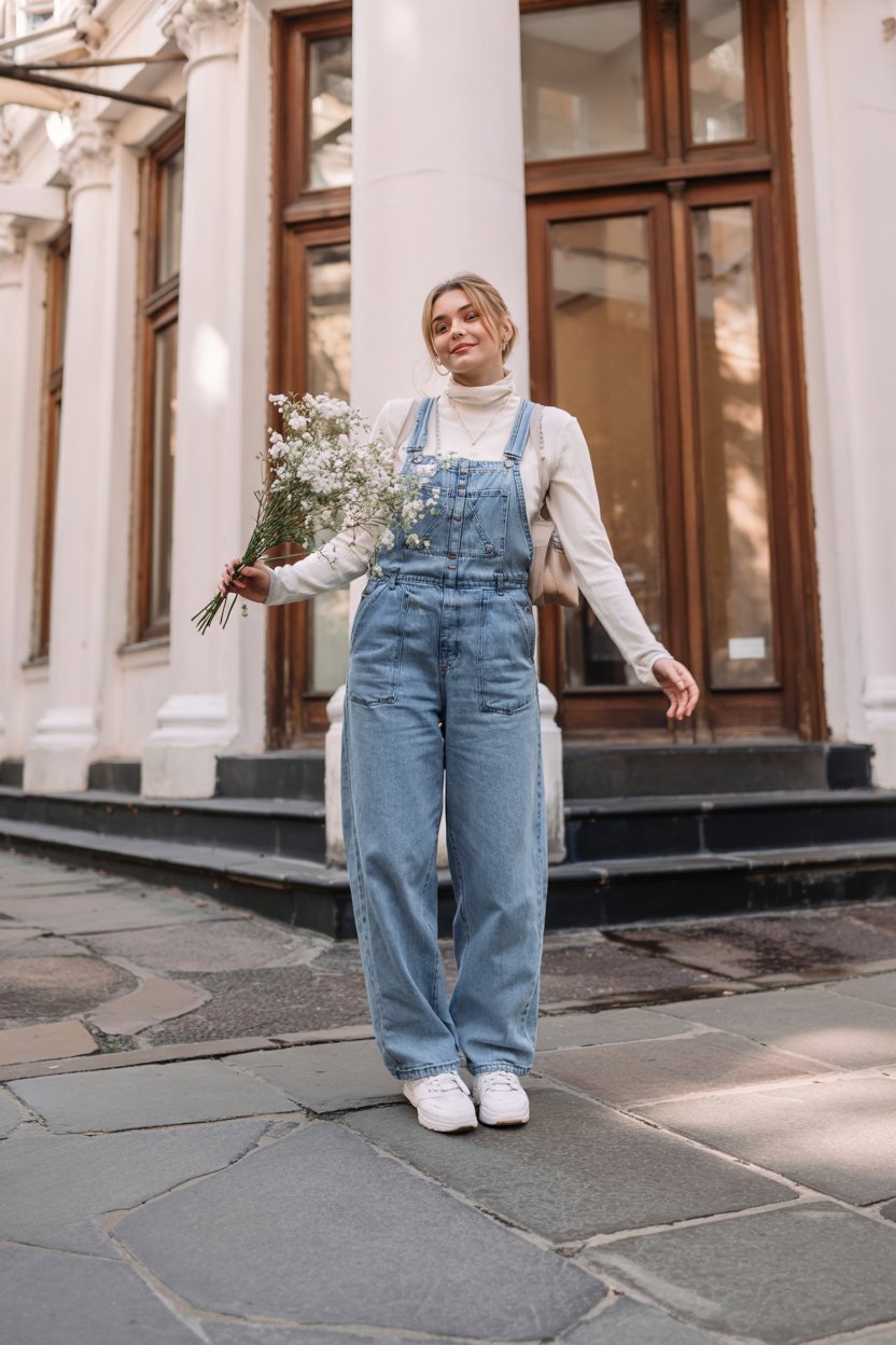 This outfit is the definition of gentle, everyday romance: light blue overalls paired with a cream turtleneck and simple white sneakers. The wide leg creates that effortless drape that sways as you walk, while the soft knit top keeps everything feeling cozy and feminine. It’s an easy, breathable look that still feels thoughtful enough for coffee dates, errands, or a casual office.