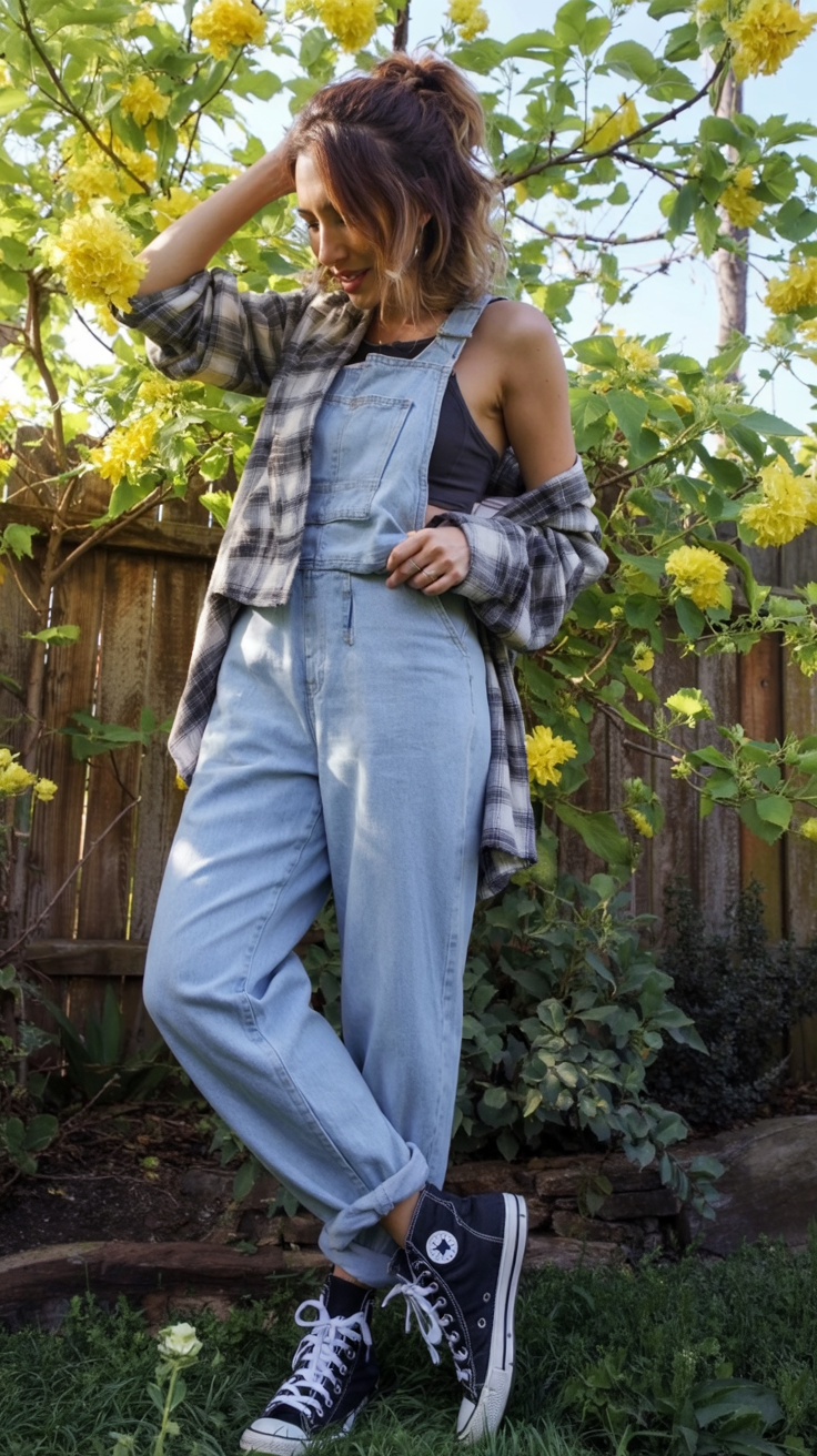 There’s so much joyful energy in this outfit: light wash overalls, a fitted tank, and an oversized plaid shirt thrown on top while you wander through a garden of bright yellow blooms. Rolled cuffs and classic high-top sneakers give a cute, easygoing finish that feels perfect for spring and summer afternoons, whether you’re in the backyard or at a weekend market.