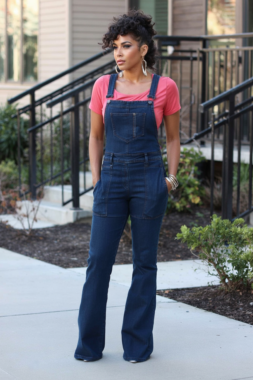 There’s such a confident ease in this look: rich dark Jean overalls with a subtle flare, paired with a soft coral tee that instantly brightens the face. The silhouette hugs through the hips and then opens below the knee, so every step has a little swish of drama. Hoop earrings, stacked bangles, and natural curls pulled up high give the whole outfit a polished yet effortless aesthetic that feels perfect for a busy day in the city.