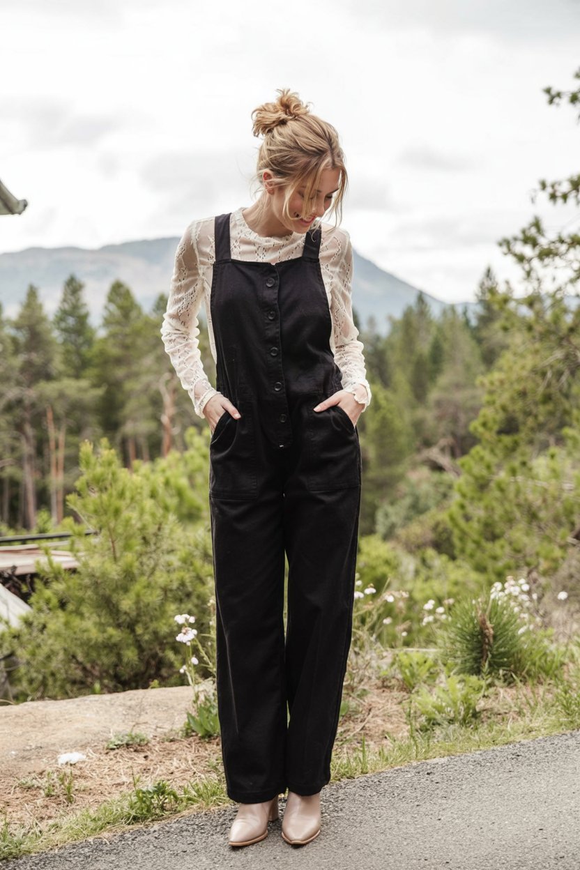 There’s a dreamy, outdoorsy romance to this look: Black overalls buttoned down the front, layered over a delicate lace blouse, with soft neutral boots grounding everything. The combination of sturdy fabric and airy sleeves creates such a pretty contrast against the forest backdrop, like a little bit of city style dropped into a mountain retreat. It’s feminine without being fussy and practical enough for wandering trails or exploring a cabin town.
