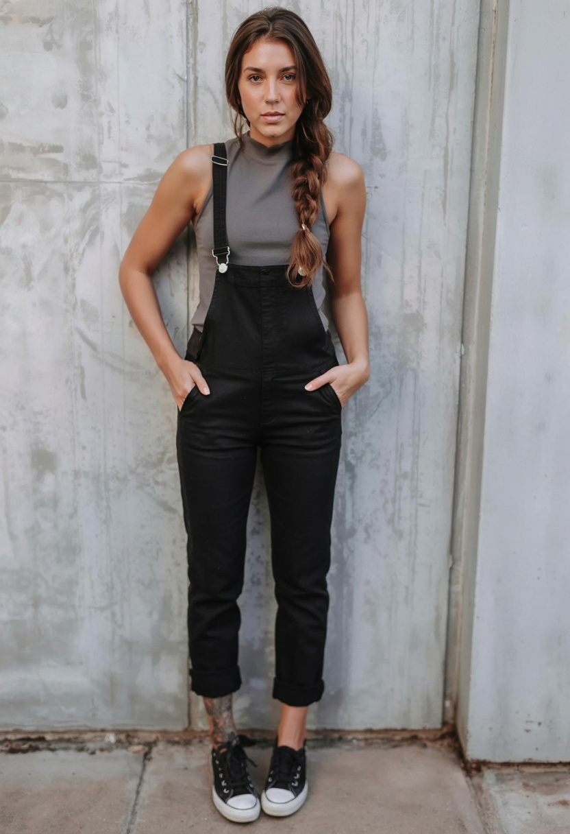 There’s a quiet power in this look: jet-black overalls, a high-neck tank, and classic black-and-white sneakers. The clean lines, cropped hem, and simple color palette give strong minimalist energy, while the loose braid softens everything just enough. It’s the kind of outfit that doesn’t shout for attention but absolutely turns heads, especially when you’re striding down the street with your hands tucked comfortably in those front pockets.