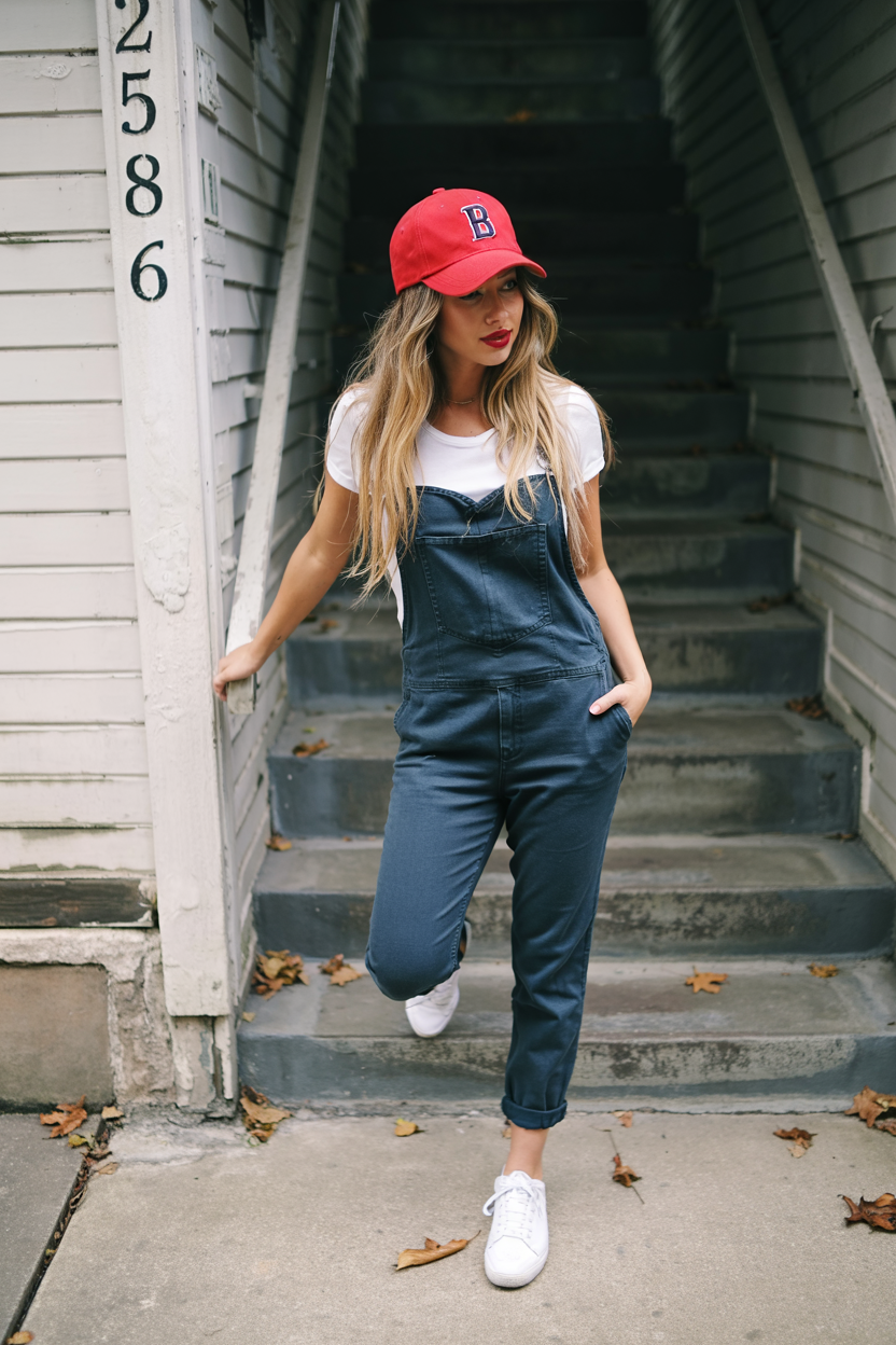 This outfit feels like a weekend ball game in the best way: slim dark overalls layered over a simple white tee, finished with a bright red cap and matching lip. It’s sporty, playful, and just a touch nostalgic, like a grown-up take on your favorite childhood dungarees. The rolled hems and clean sneakers keep the overall dress outfit’s vibe casual but intentional, so you can run errands, grab lunch, and still feel cute in every selfie.