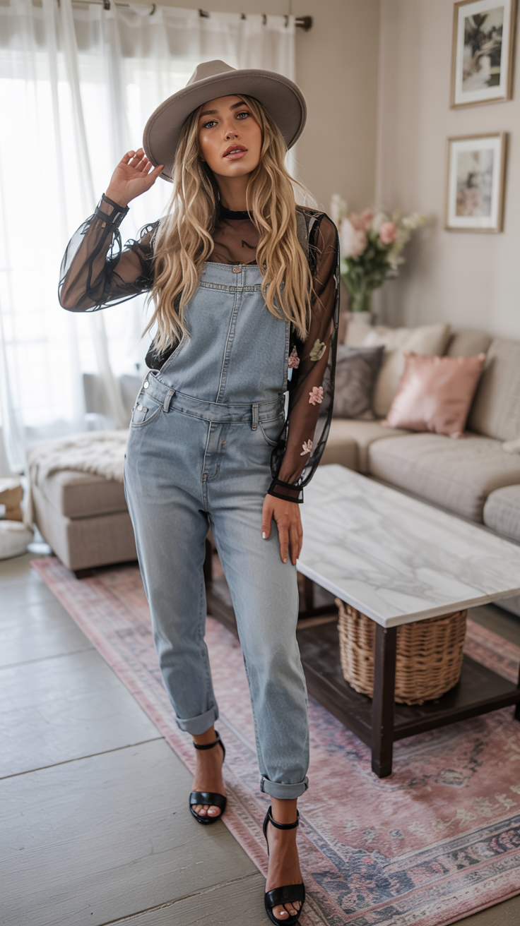 Soft blue denim gets a romantic twist here with a sheer black top scattered in delicate florals layered under classic overalls. The combination feels unexpectedly dressy, like you took something playful and gave it a little evening makeover. Strappy heels and a wide-brim hat keep the outfit feeling elevated, so you could easily wear this to a dinner date or a girls’ night and still be the most relaxed person in the room.