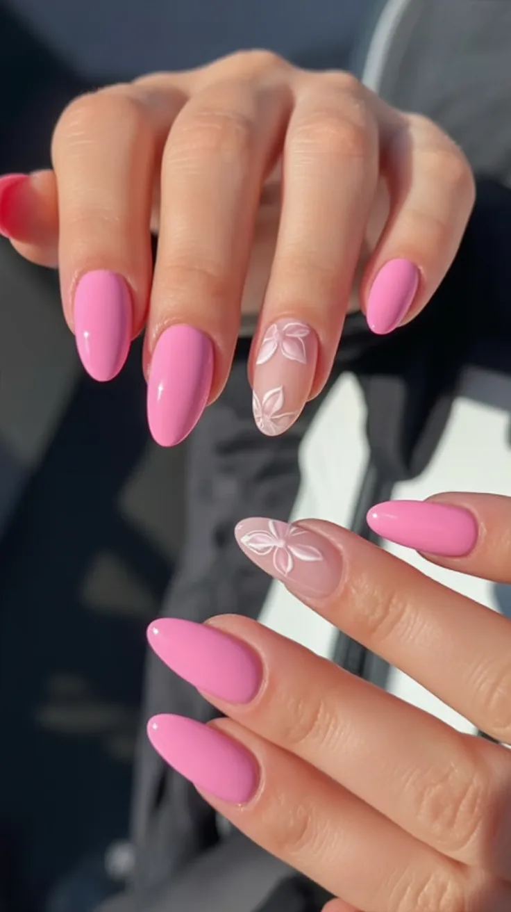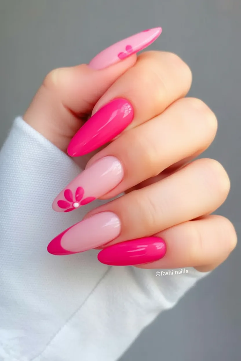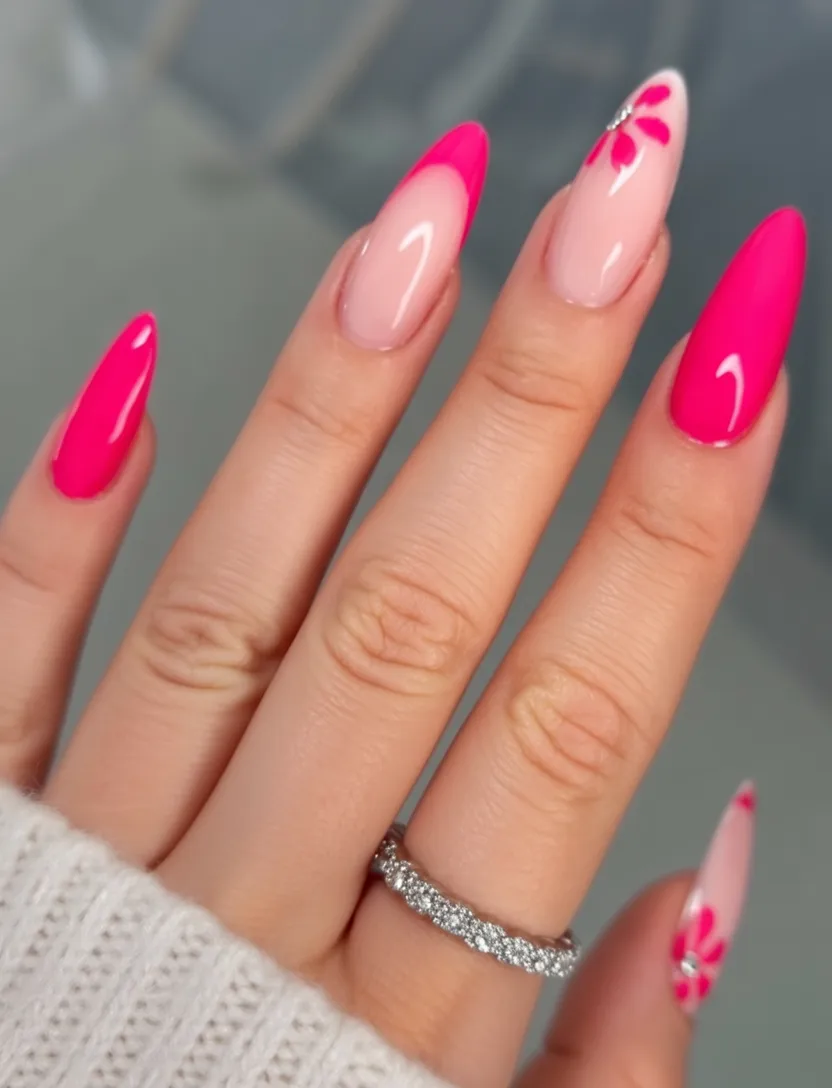 13. Hot Pink Almond Nails with Bold Floral Accent