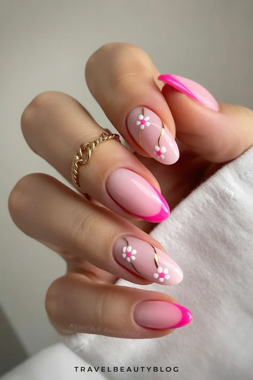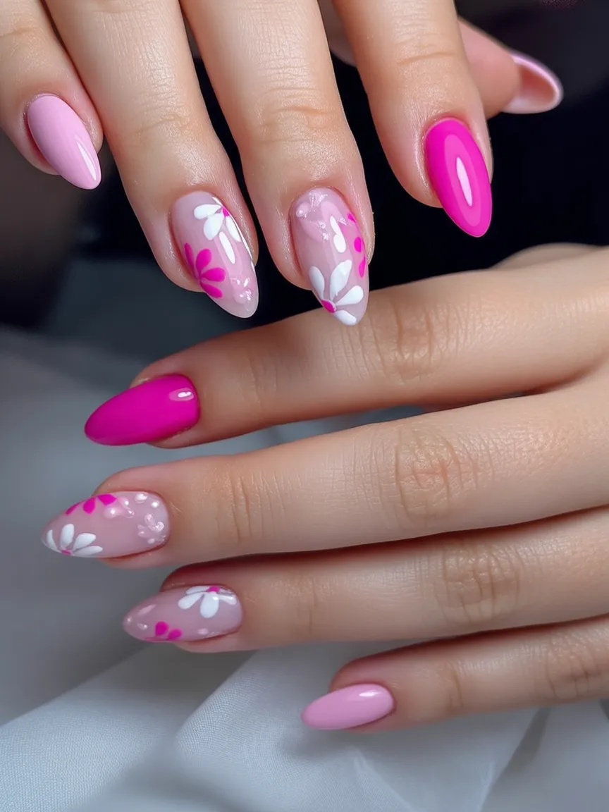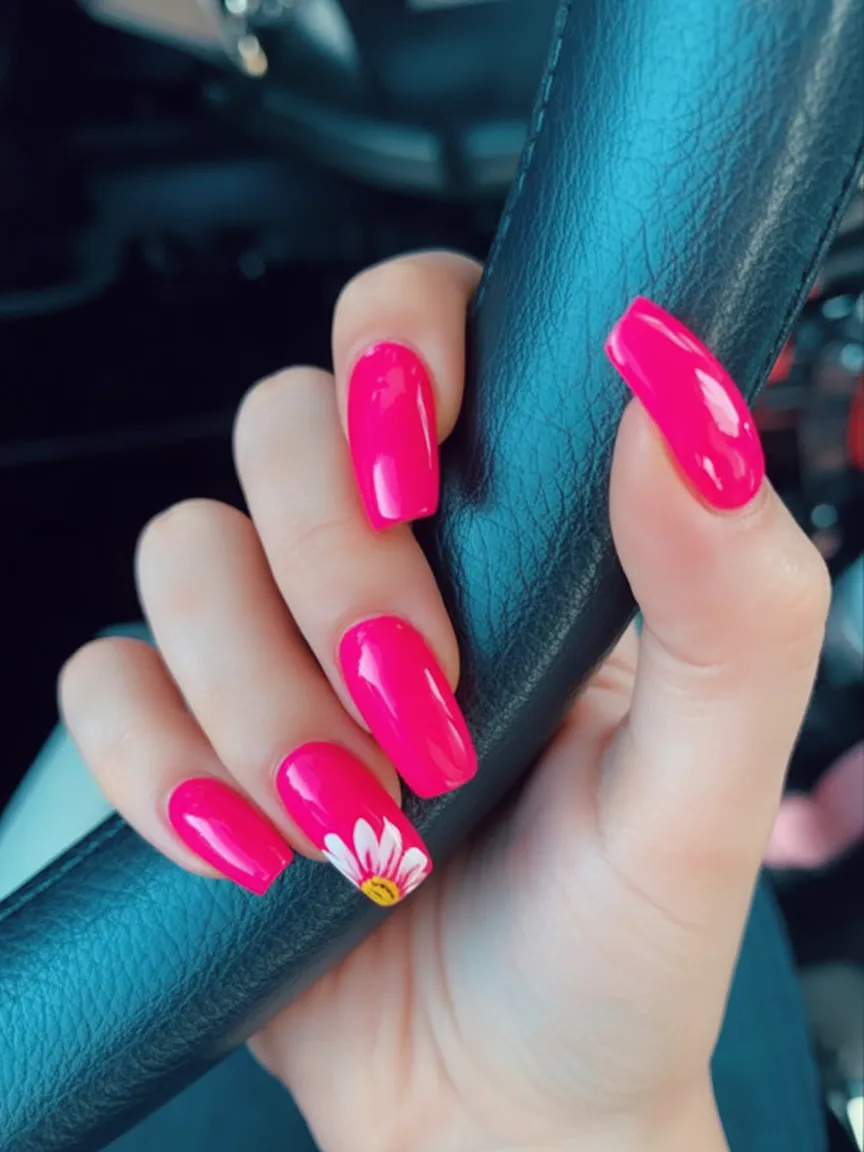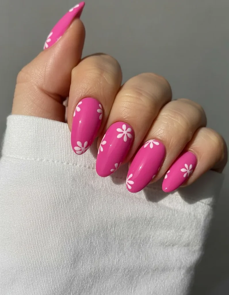11. Bright Pink Almond Nails with Daisy Accents
