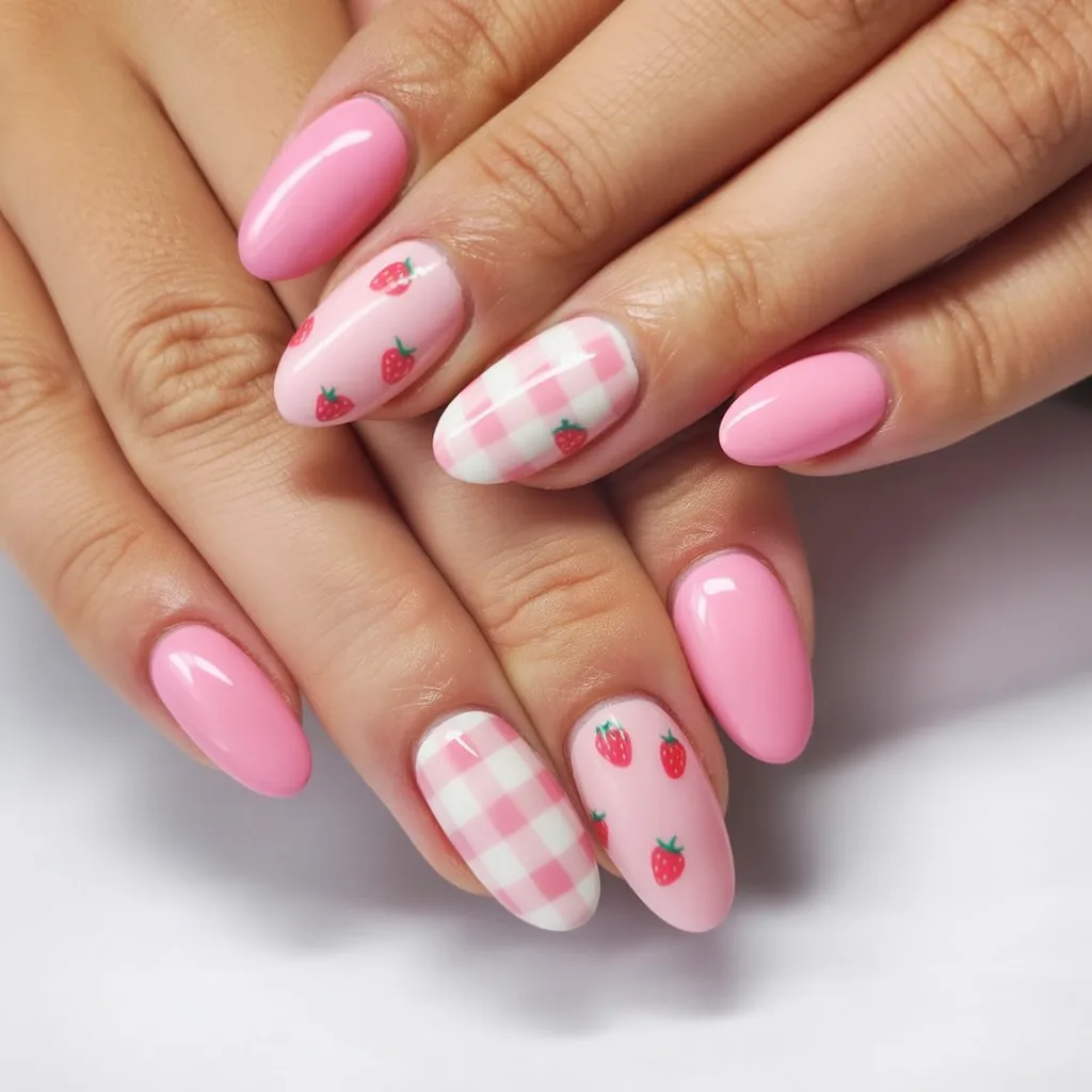 There’s something instantly joyful about this look—like a quiet reminder that spring doesn’t have to shout to be noticed. The almond shape feels graceful and grown-up, while the soft pink base paired with tiny strawberry details brings a playful, almost nostalgic sweetness. It’s Cute without feeling juvenile, and it has that “effortlessly put together” vibe that works whether you’re holding a coffee cup or waving hello across a brunch table.
