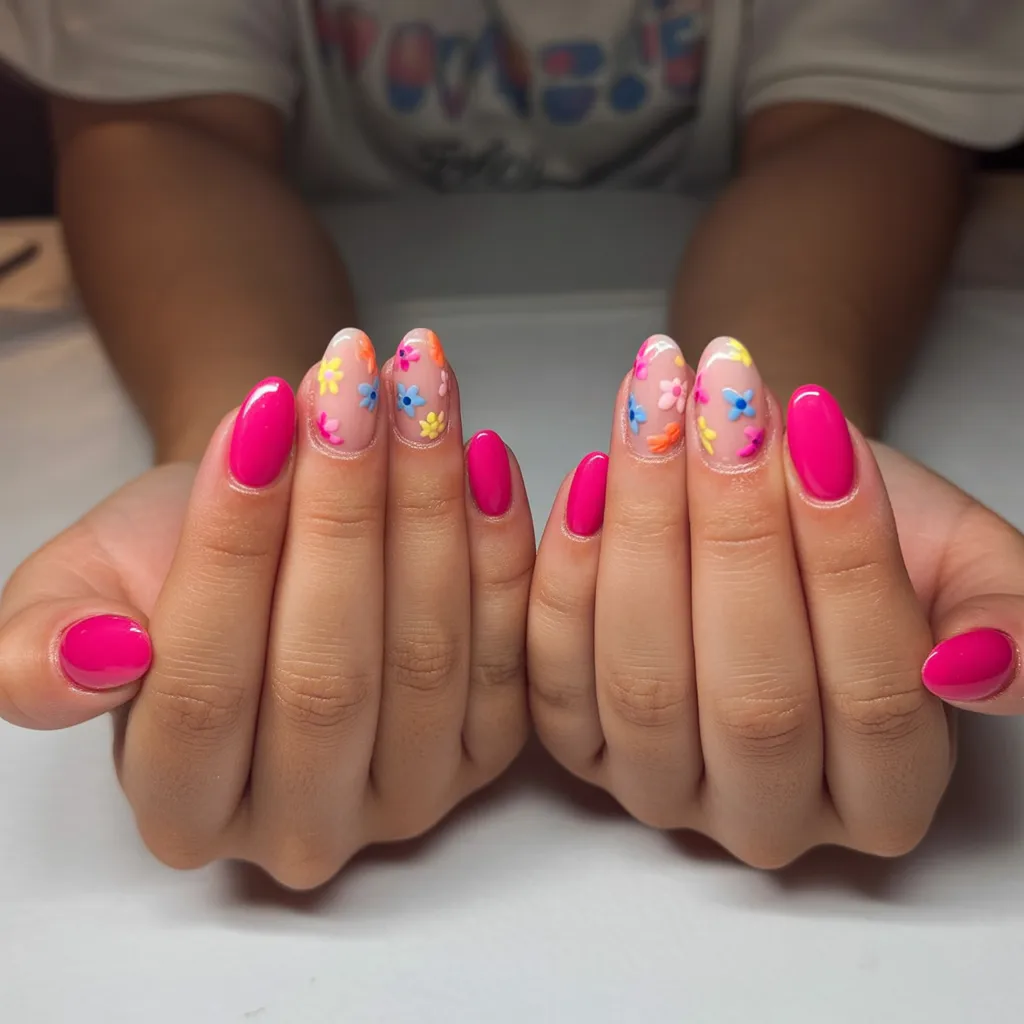 14. Bright Pink Nails with Multicolor Flower Art