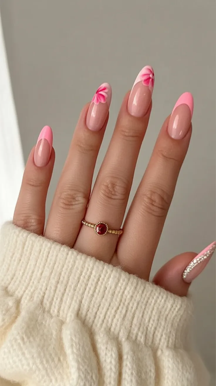 21. Soft Pink French Almond Nails with Floral Tips